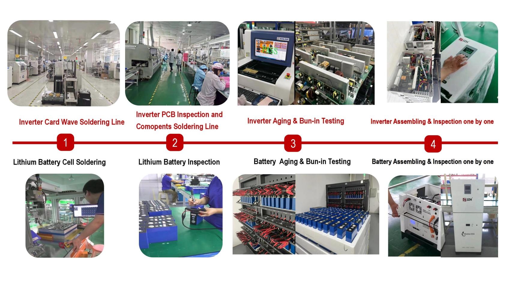 پروڈکشن ڈی پی ٹی۔ : ہمارے پروڈکشن ڈی پی ٹی کام کے تحت آرڈر شیڈول کے تحت ، ہمارے پاس 80 سے زیادہ کارکنوں کے ساتھ 3 خودکار پروڈکشن لائن ہے۔ ہماری پیداوار بنیادی طور پر خودکار پروڈکشن لائن کے ذریعہ تیار ہوتی ہے ، کیونکہ بی ایم ایس / پی سی / ای ایم ایس کے انورٹر پی سی بی کو مکمل طور پر ہماری لہر سولڈرنگ مشین لائن خود بخود تیار کیا جاتا ہے ، اور لتیم بیٹری پیک خود بخود مشین کے ذریعہ سولڈرنگ کر رہا ہے۔ ہماری سخت کوالٹی کنٹرولنگ ٹیم کے ساتھ تمام پروڈکٹ تیار اور ایک ایک کرکے تجربہ کی جاتی ہے۔